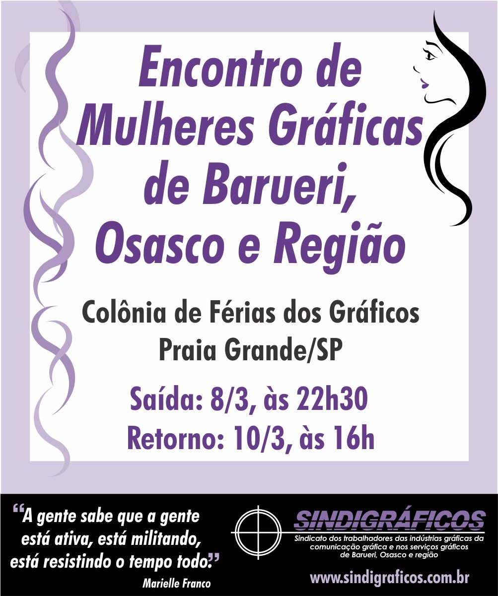 Em comemoração ao Dia Internacional da Mulher, o Sindigráficos realizará mais um Encontro de Mulheres Gráficas de Barueri, Osasco e Região! O evento acontecerá nos dias 8, 9 e 10 de março, na Colônia de Férias do Sindicato dos Gráficos de São Paulo, localizada na Praia Grande, litoral sul de São Paulo.