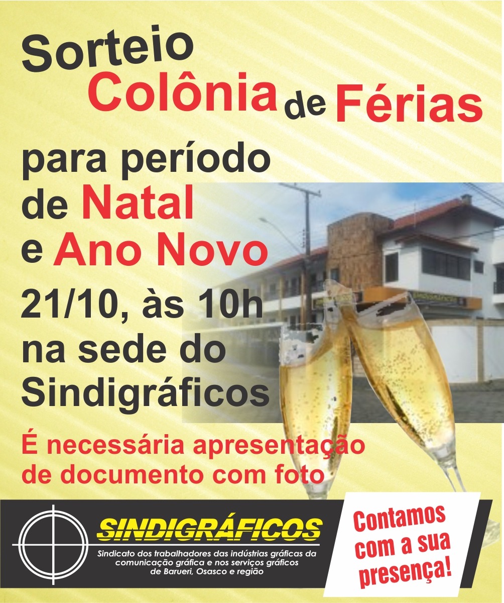No dia 21/10, o Sindigráficos realizará sorteio com os associados que querem se hospedar na Colônia de Férias, em Peruíbe, no período de Natal e Ano Novo.