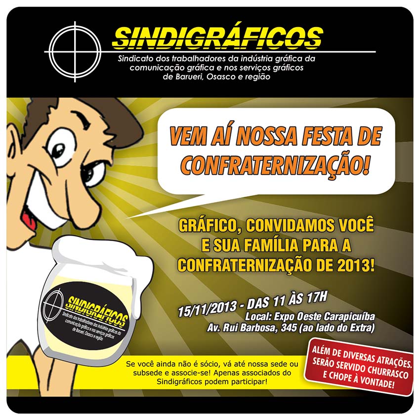 O Sindigráficos convida todos os gráficos associados e suas famílias para participar da Festa de Confraternização 2013. Esse ano, o evento acontecerá no dia 15/11, das 11h às 17h, no Expo Oeste Carapicuíba, localizado na Avenida Rui Barbosa, 345.